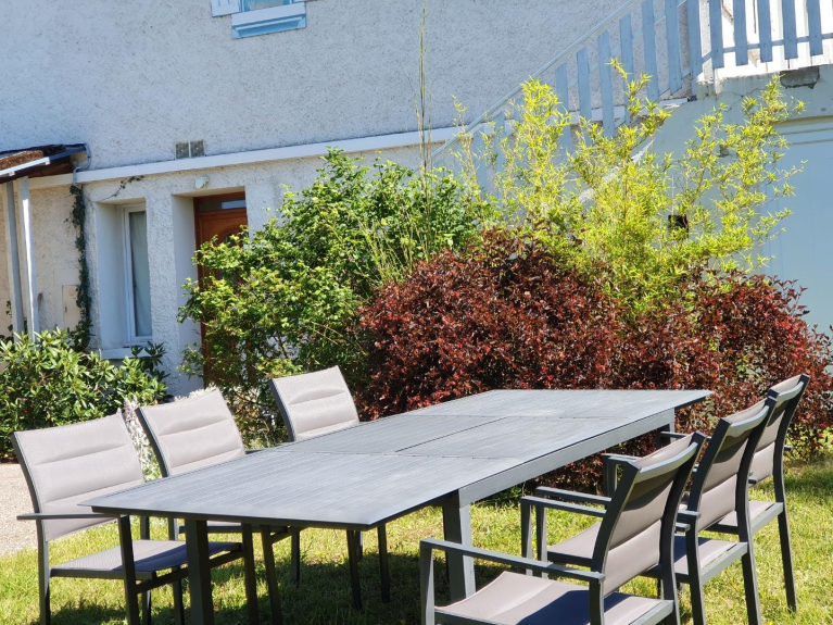 En été : Jardin arboré avec salon de jardin, tennis de table, barbecue.