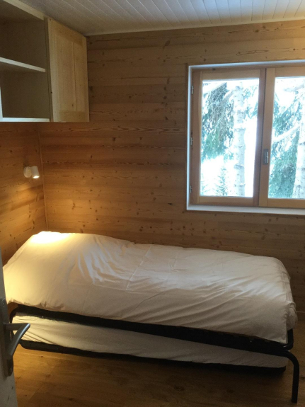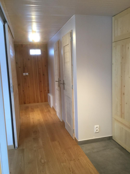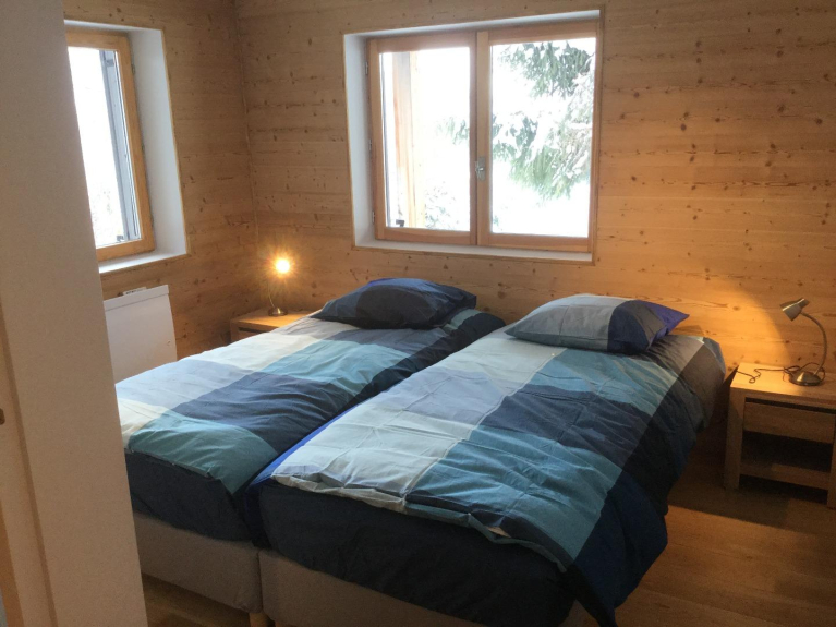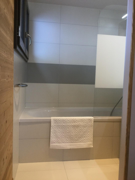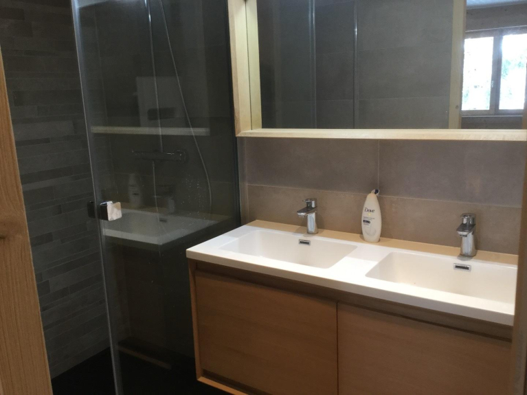 Le niveau inférieur comprend un casier à skis avec sèche-chaussure, une vaste entrée avec de nombreuses pancartes, lave-linge et sèche-linge, une chambre avec deux lits de 200 x 90 cm, une deuxième chambre avec un lit gigogne (deux lits de 190 x 80 cm ou un lit de 190 x 160), une salle de douche avec double vasque et douche à l'italienne et des toilettes indépendantes.