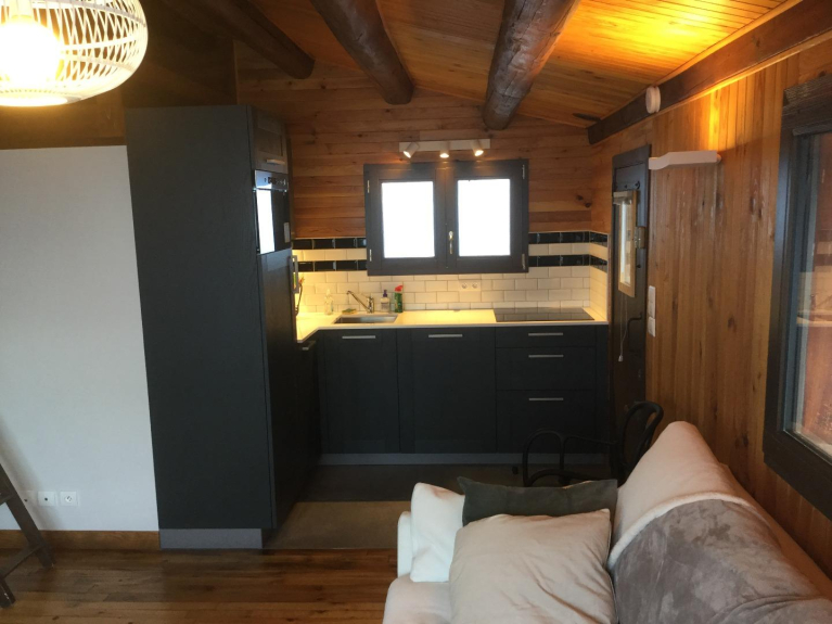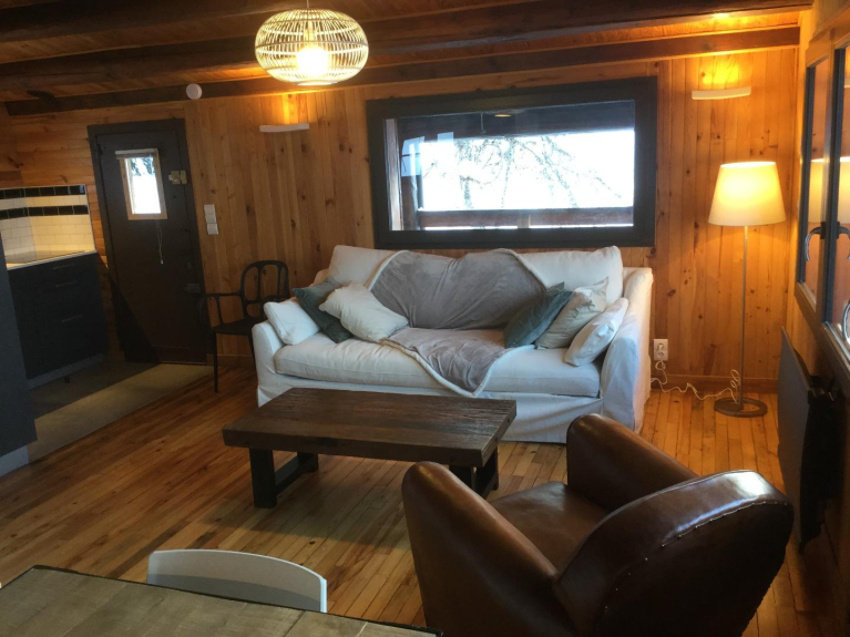Le niveau supérieur comprend le salon, salle-à-manger avec cheminée, une suite parentale avec un lit double de 160 x 200 cm, un écran plat (internet/wifi illimité/abonnement freebox TNT et chaînes internationales) et une salle de bain ouverte sur la chambre. Une cuisine équipée est ouverte sur le salon, salle à manger avec cheminée. La grande terrasse de 20 m2 est de plain pied avec le séjour. Une deuxième terrasse est accessible au niveau inférieur, attenante à un terrain arboré.