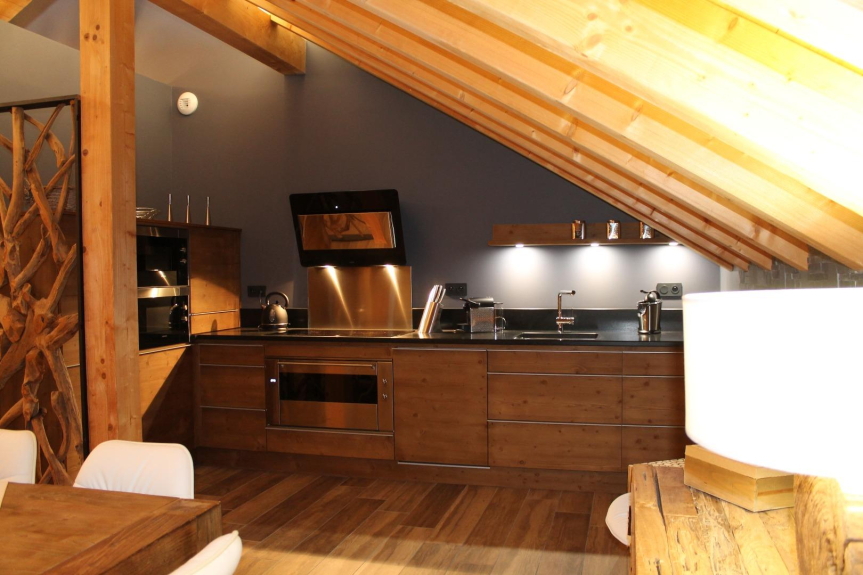 A l'étage, la pièce à vivre est baignée de lumière grâce à d'immenses baies vitrées et offre l'accès à un balcon-terrasse. Le salon-salle à manger dispose de deux grands canapés, d'un coin TV avec un canapé, et d'une cheminée. La cuisine est entièrement équipée (réfrigérateur, four, plaque à induction, lave-vaisselle, hotte aspirante, 2 micro-ondes...).