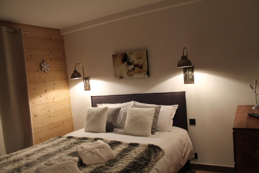 La chambre Les Écrins dispose d'un téléviseur, d'un point d'eau avec douche à l'italienne, de sèche serviette, de sèche cheveux et d'un lit en 160 avec literie de très grand confort et sur-matelas.