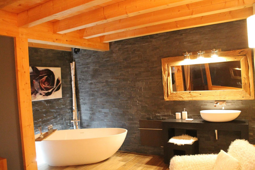 Dans la chambre "Meije", on trouvera une baignoire îlot XXL, un lit en 160 et un accès à une terrasse.
