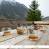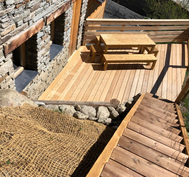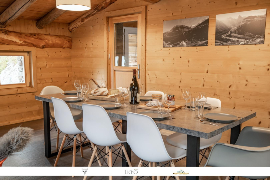 - Un espace de vie de 40 m² très ouvert avec la charpente apparente du chalet et une magnifique vue sur les montagnes, avec un accès à la terrasse extérieure avec table, bancs et transats.