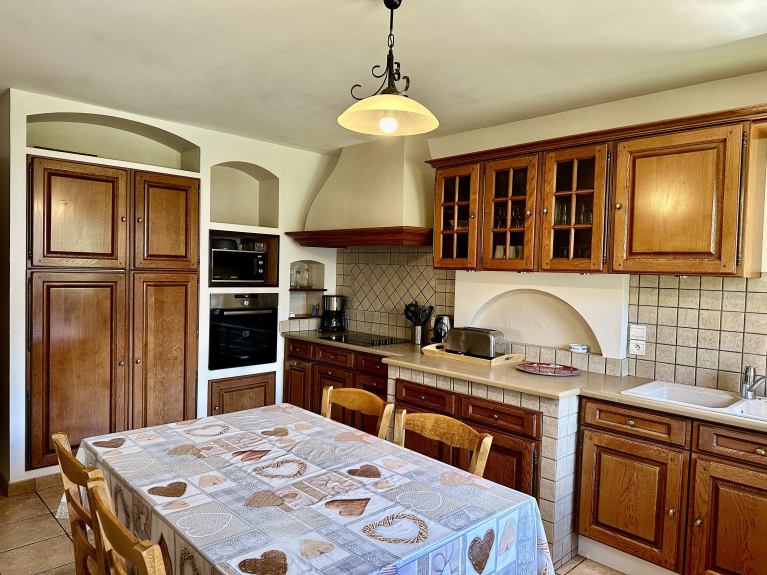 Grande cuisine ouvrant sur le séjour avec réfrigérateur, plaque vitrocéramique, micro-ondes, four pyrolyse, lave-vaisselle.