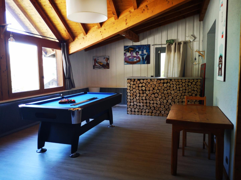 Au rdc, 150m2 d'espace : salon avec poêle à granulés, billard, baby foot, télévision, bibliothèque, jeux de société, wifi...