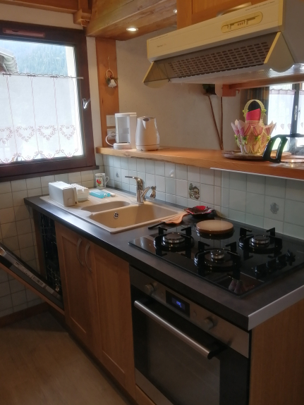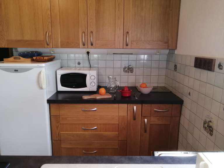 - Kitchenette équipée : cuisson gaz- élec. four et micro-ondes, Lave vaisselle, réfrigérateur, meubles chêne