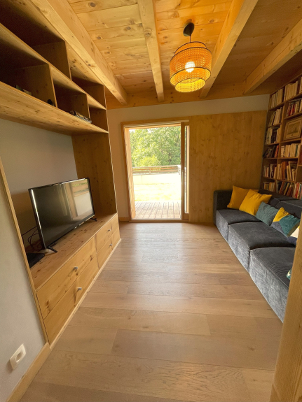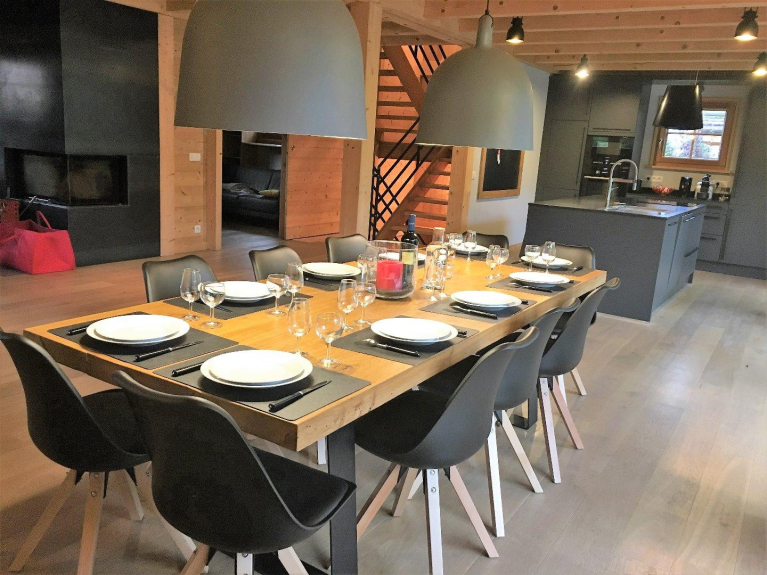 La pièce de vie de 100 mètres carrés dispose d’un salon confortable avec cheminée et d’un salon TV indépendant. La cuisine équipée vous permettra de préparer de délicieux repas que vous pourrez déguster dans la salle à manger ou sur la terrasse en bois, de plein pied plein sud : bonhommes de neige l'hiver et repas en extérieur dès que le temps le permet. Nous mettons à votre disposition appareils à raclette, pierrade, fondue savoyarde.