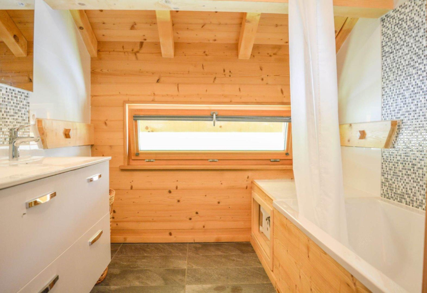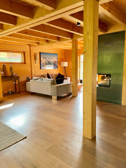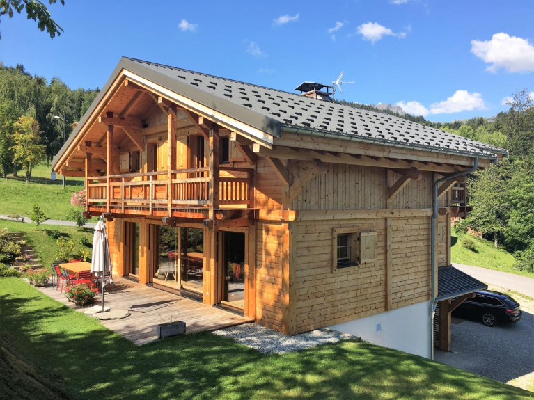 Ce chalet de 225 mètres carrés respecte la tradition des chalets en bois construits par les compagnons du Tour de France avec sa structure en bois robuste et imposante.