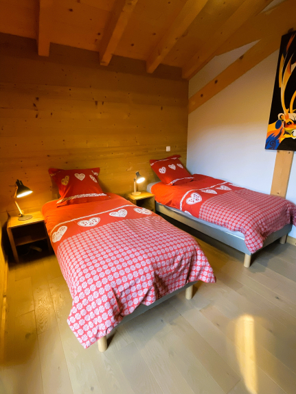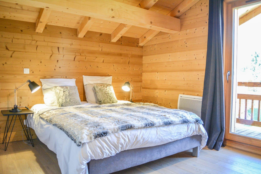 Au premier étage, 4 chambres spacieuses avec balcon bénéficient d'une belle vue sur les montagnes : 2 donnent sur le Mont-Blanc et 2 sur la chaîne des Aravis. Trois d’entre elles comportent des lits doubles en 160 cm, et la dernière comprend deux lits simples en 90 cm.