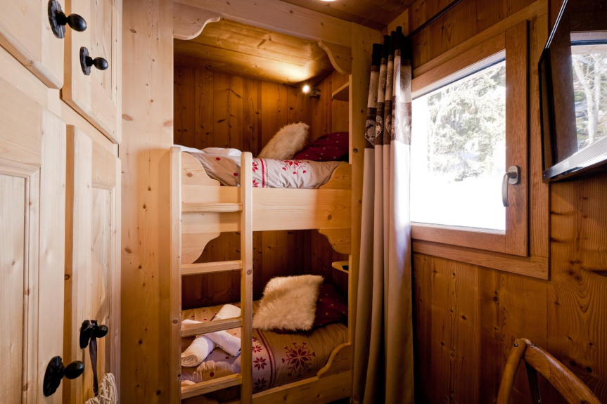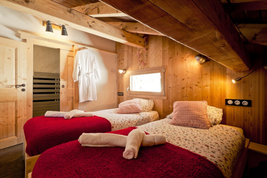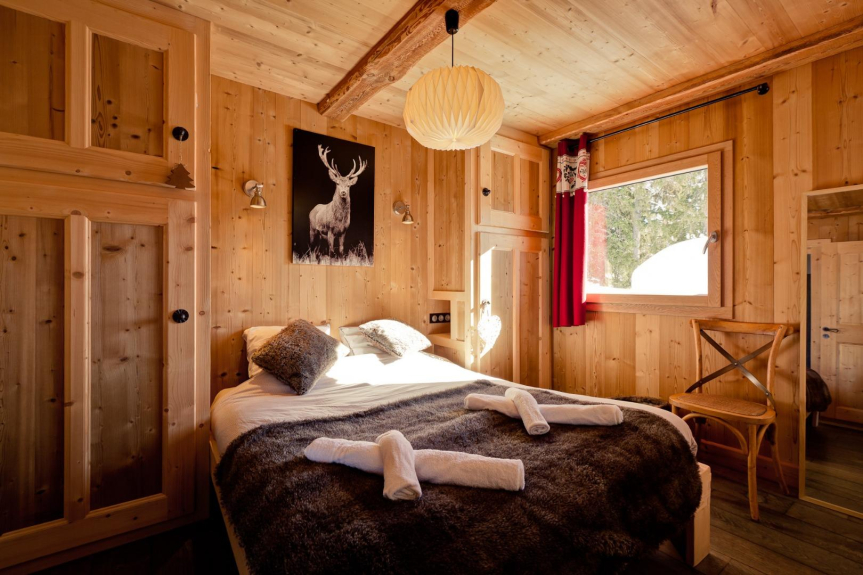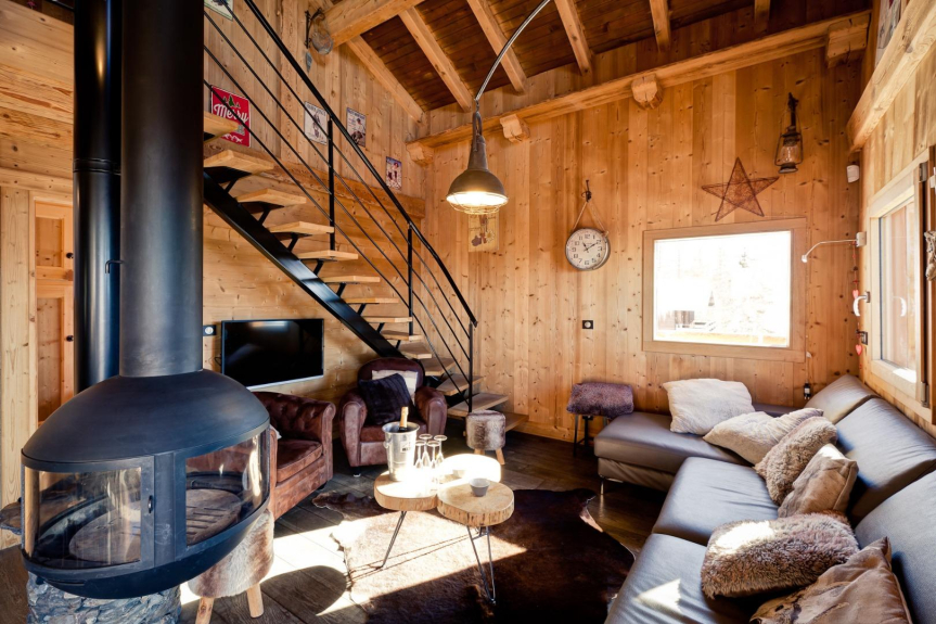 Prestations haut de gamme au Chalet BOSOLEIL , chambres avec TV et salle de bain attenante , salon cosy , vaisselle , électroménager et matériel de cuisine premium , cheminée , local à ski avec sèche-chaussures , Jacuzzi extérieur Privatif dans son petit chalet ,
