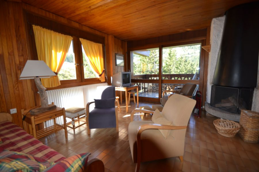 Séjour avec terrasse et vue panoramique sur les sommets.