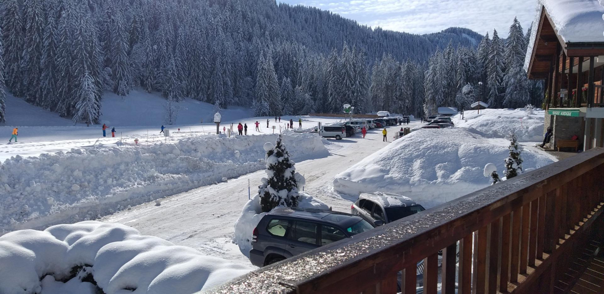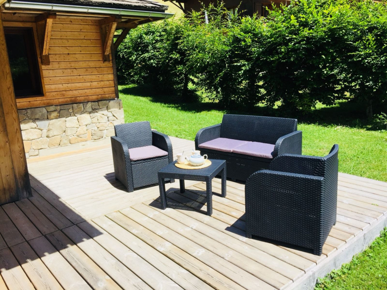 La terrasse dégagée et ensoleillée avec vue sur les pistes de ski de fond l'hiver, la montagne la Pointe Percée ainsi que sur les vieux chalets savoyards.