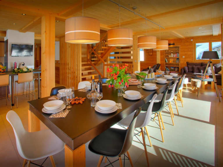 Les deux coins Lounge sont équipés d’un bar, d'une piste de danse et d’un confortable salon près de la cheminée. La cuisine équipée s’ouvre sur l’espace repas, qui peut accueillir tous les convives autour de la table. De grandes baies vitrées donnent sur la terrasse. Il y a également une salle d’eau à ce niveau et des toilettes indépendantes à chaque étage. Le local à ski dispose d’un sèche-chaussures et de rangements pour votre matériel. Et un tout nouvel abri sécurisé est à disposition pour ranger votre vélo, avec borne de recharge pour vélo électrique.