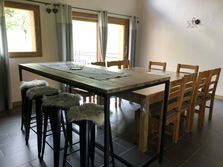 - Séjour avec cuisine entièrement équipée (four, micro-ondes, lave-vaisselle, cafetière filtre, cafetière Dolce Gusto, plaque induction, frigo-congélateur, appareils à raclette, poêlons à fondue...), coin salon avec baclon, canapé pouvant servir de lit d'appoint