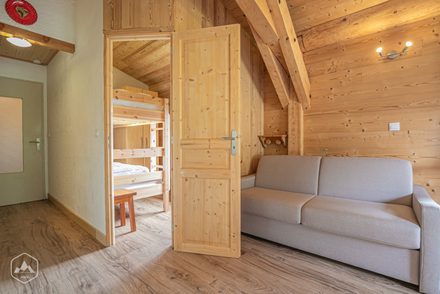 L'appartement Linaigrette 3 a été entièrement refait avec des matériaux sains (laine de bois, épicéa, sapin). Le séjour avec de belles hauteurs sous toit, la charpente apparente et claire, une boiserie chaleureuse ainsi qu'une baie vitrée permettant d'avoir une pièce agréable et lumineuse donnant sur le balcon exposé plein sud avec une vue dégagée sur les pistes et la montagne environnante.