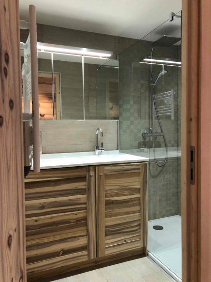 - Salle de bain avec plan vasque de 120cm, grande douche 90x160, sèche serviettes soufflant, lave-linge LG et armoire de toilette