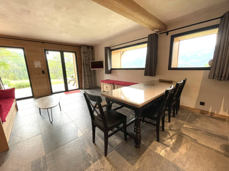 En rez de jardin d'un chalet, appartement de 70m² pour 6 personnes. Il bénéficie d'une grande terrasse en exposition Sud-Ouest avec une vue exceptionnelle sur le village, le Mont Charvin et la vallée.