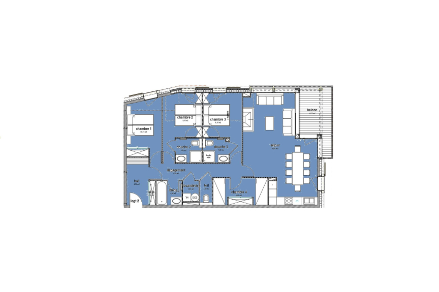 Le Lys, le Bleuet, le Rhodo et la Gentiane, de 4 et 5 pièces, de 100 m² à 107 m², accueillant 8 à 10 personnes avec des prestations de grande qualité, des équipements modernes, et une décoration authentique et raffinée.