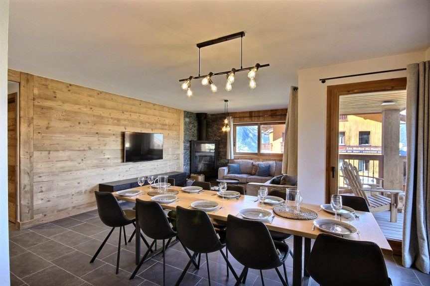 Appartement classé 5 étoiles très lumineux avec vue sur le front de neige, La Gentiane bénéficie d’un salon spacieux avec cheminée et bel espace cuisine salle à manger donnant sur un grand balcon orienté Est.