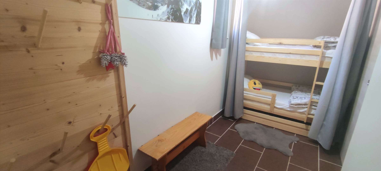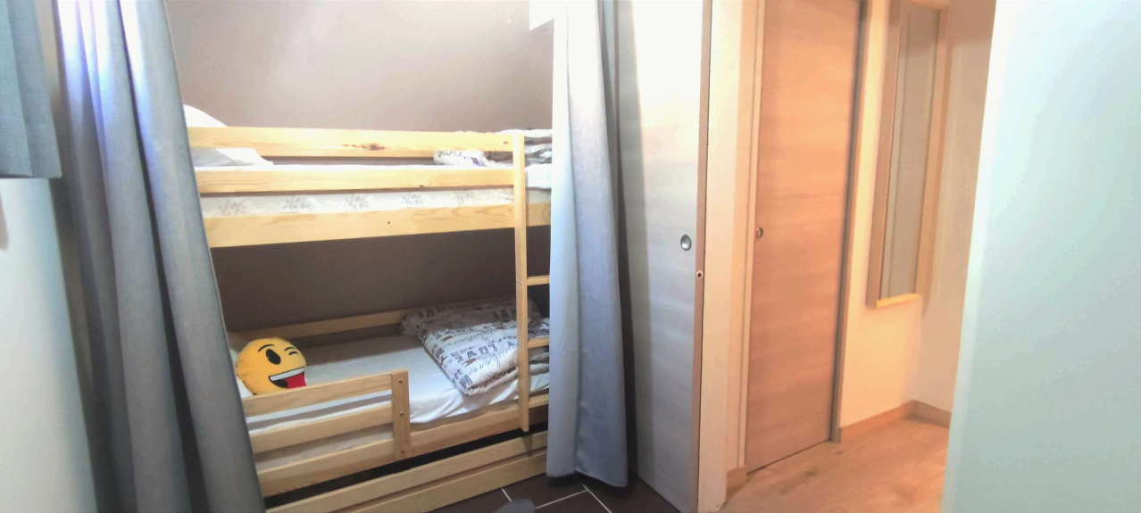 Séjour composé d'un coin détente, canapé lit 2 places 160, télévision, chambre 1 donnant sur extérieur avec TV, canapé lit 160, chambre 2 intérieure lit 140, grande cuisine américaine avec coin repas, coin nuit avec 2 lits superposés longueur 160 (réservés aux enfants, ne conviennent pas aux adultes), salle de bains WC, WC séparés, parquet au sol. Pas d'internet.