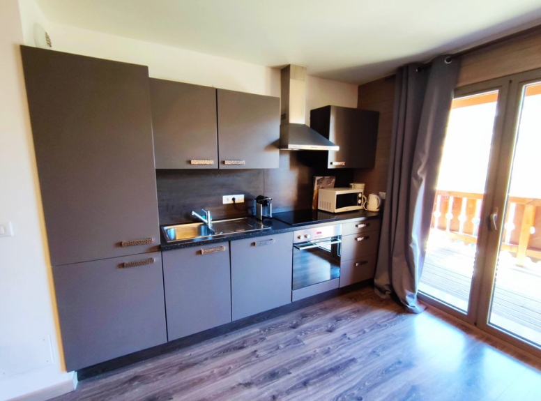 Appartement composé d'un salon avec table et chaise pour 8 personnes, un canapé, télévision; d'une cuisine américaine avec four traditionnel, micro onde, plaque 4 feux, réfrigérateur avec partie congélateur 3 tiroirs; de 2 chambres avec un grand lit en 160 x 200cm (dont une avec balcon plein sud et l'autre avec fenêtre); d'une salle de bains avec baignoire communicante aux 2 chambres doubles, d'une chambre intérieure avec fenêtre et store et 2x2 lits superposés (réservés aux enfants, ne conviennent pas aux adultes) en L (salle de douche privative), d'un WC situé à l'entrée de l'appartement.