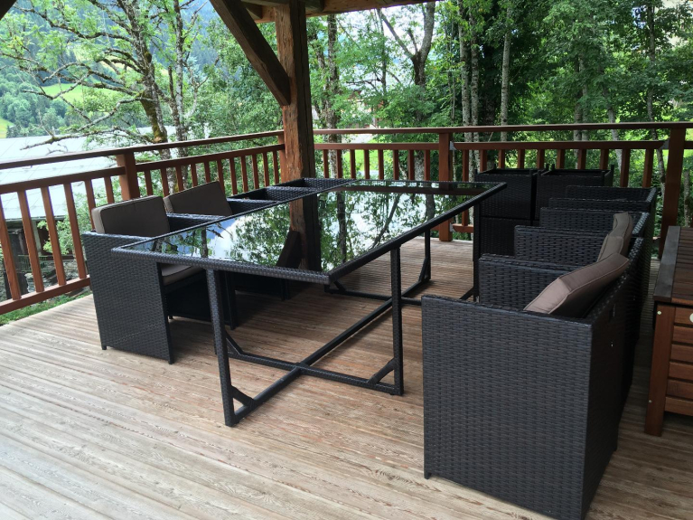 • Grande pièce à vivre avec poêle à bois ouvrant sur un balcon (vue sur le Mont-Blanc) et sur une très grande terrasse (55 m2) en partie couverte (équipée de tables et chaises pour 12 personnes et d’une plancha électrique) au 1er étage