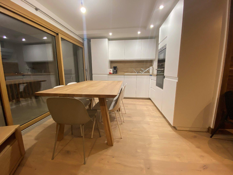 Salon salle à manger avec canapé lit 140 bed express. Terrasse extérieure. Grande baie vitrée et vue magnifique plein sud. Appartement au 1er étage avec casier a skis et casier a chaussures. Beaucoup de rangements et grande cuisine tout équipée (grand réfrigérateur congélateur, four, micro ondes, plaque induction 4 feux, casseroliers, armoire de rangement etc.).