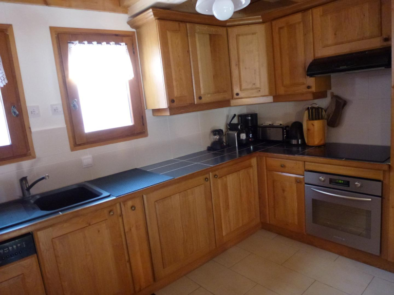 Avec: 1 lave vaisselles 1 four électrique 4 plaques induction 1 hotte aspirante 1 réfrigérateur plus congélateur sur le dessus 2 grilles pain 1 four micros ondes 1 cafetière électrique 1 Théière électrique 1 Bouilloire 1 cafetière expresso électrique 1 Support casiers à bouteilles 1 Dérouleur papier alu 1 Egouttoir évier 1 Spot au dessus évier 1 Néon au dessus table de travail1 Poubelle sou évier 2 Lampes cuisine