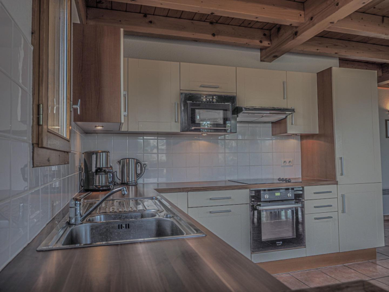 La spacieuse pièce à vivre grande pièce qui comprend le salon, la cuisine et la salle à manger s’étend sur deux étages et possède de grandes fenêtres où l’on peut observer la belle vue sur les montagnes, ainsi que des couchers de soleils époustouflants. Spacieux, chaleureux et douillet, la Belle Maison est idéale pour les familles, ainsi que pour les groupes d’amis.