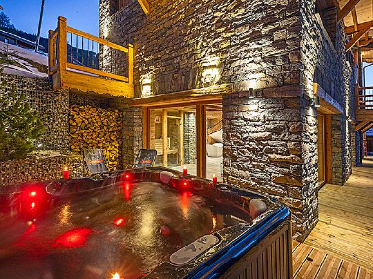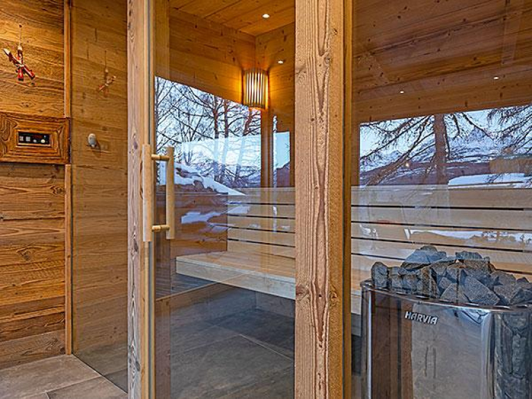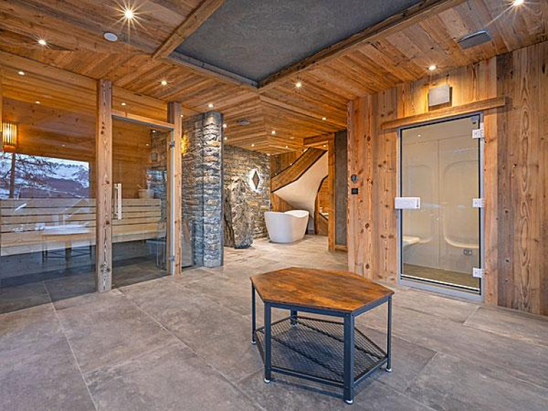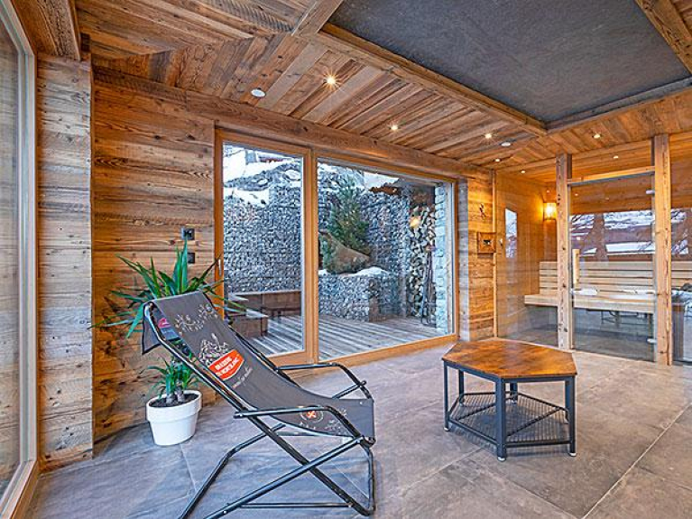 Sur ce niveau se trouve aussi le grand espace de détente : Après le ski, profitez du jacuzzi extérieur pour 6 personnes, du sauna, du hammam, du bain de refroidissement et de la douche à seau d'eau froide à tirer ; relaxez-vous dans la zone de repos avec ces chaises longues.