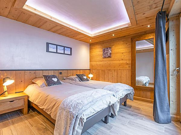 Rez-de-chaussée : L'entrée principale du chalet se trouve sur ce niveau. Il y en a une chambre à 2 personnes avec 2 lits simples rapprochables de 90 x 200 cm ; une chambre avec 3 lits simples de 90 x 200 cm. Chaque des deux dispose de sa salle de bain en suite, avec douche, lavabo et wc.