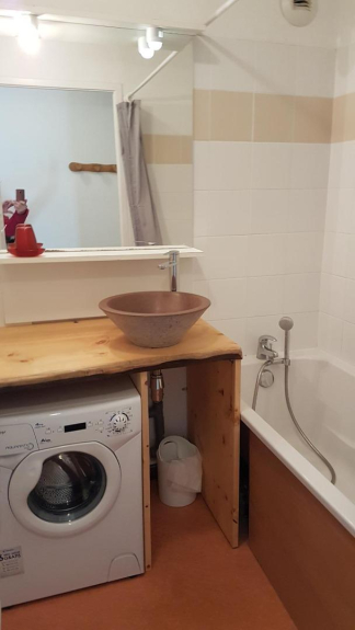 Il a une salle de bains avec machine à laver, sèche cheveux ,une salle d'eau , des wc séparés et un casier à ski .