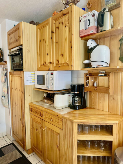 Coin cuisine : four, micro ondes, lave vaisselle, réfrigérateur, 4 plaques de cuisson, lave-linge. 1 cafetière filtre, 1 bouilloire, 1 grille pain.