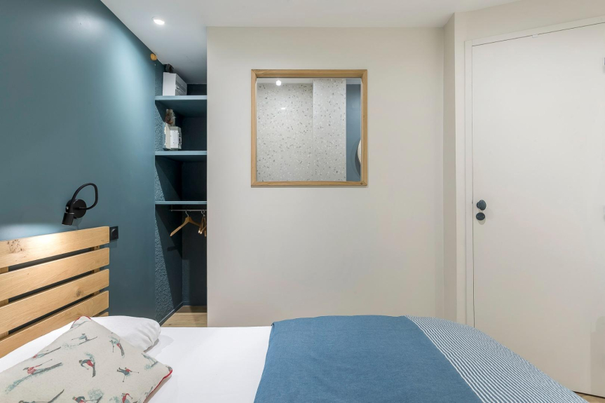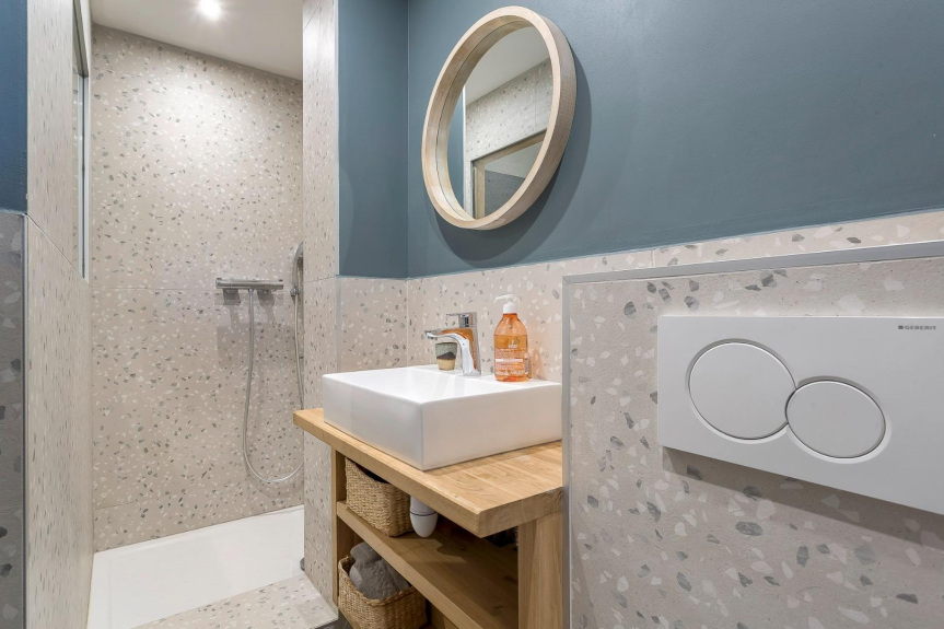 Agencement idéal pour 2 familles avec deux coins nuit/ salle d'eau distinctes et pièce de vie centrale.