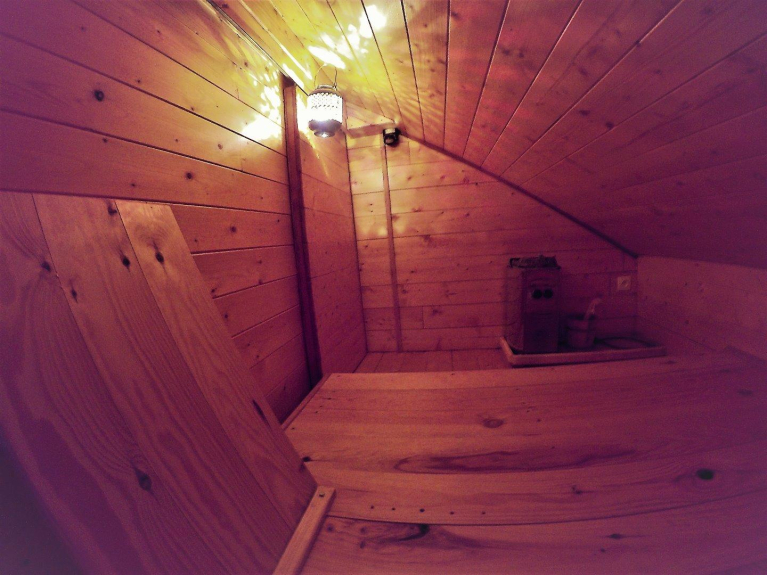 Espace SAUNA (2x2m) emménagé sous le rampant de la toiture, donc on ne s'y tient pas debout (accès par une petite porte de 1.20m)