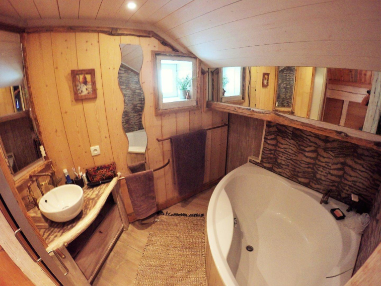 Après une journée de montagne, profitez de la baignoire d'angles dans l'ambiance reposante de la salle de bain.