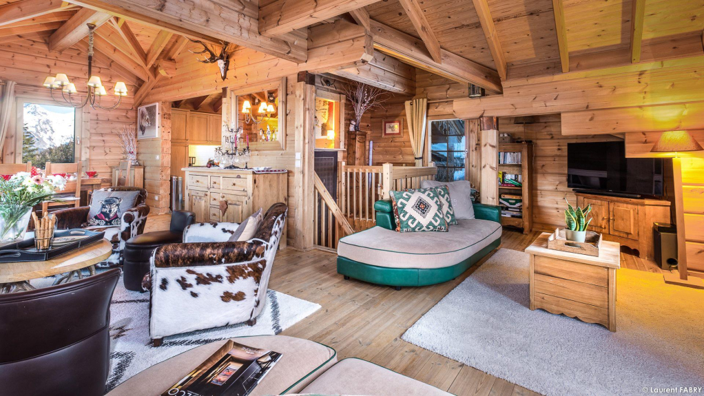 L'espace séjour au deuxième étage, offre une magnifique vue sur la vallée et bénéficie d'un coin télé, bureau et d'une véritable cuisine aménagée.