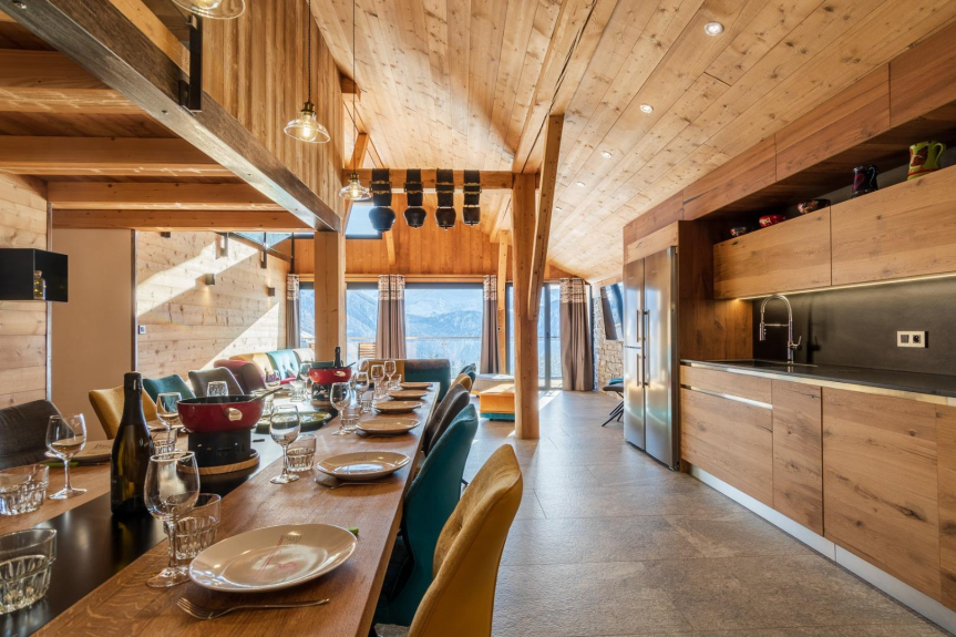 Cuisine équipée pour la réalisation de bons plats montagnards, adaptée pour une très grande famille.