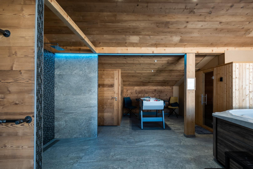 Vous disposerez également d’un espace loisir et détente, un sauna chromothérapie 4 places allongées ou 8 places assices, un SPA à débordement 7 places, douche, wc, un baby foot et luge à disposition.