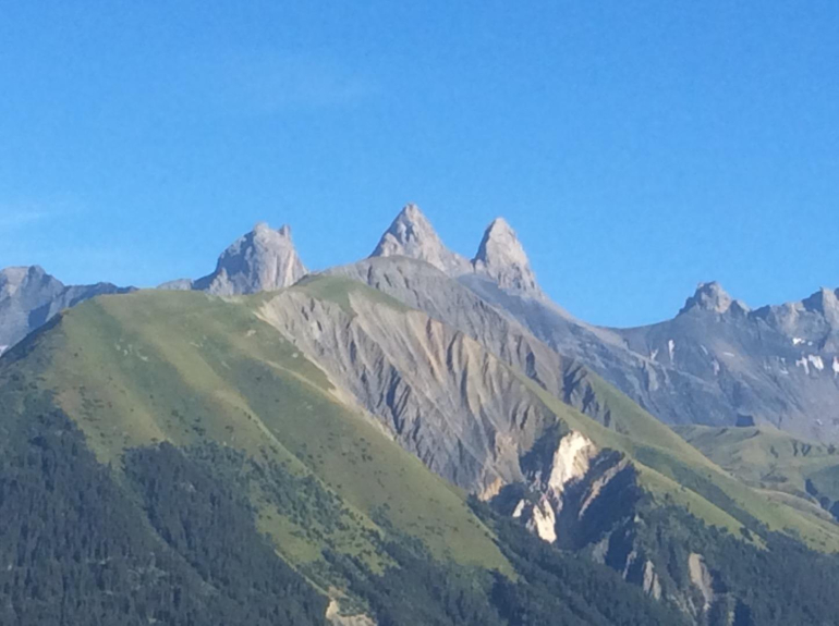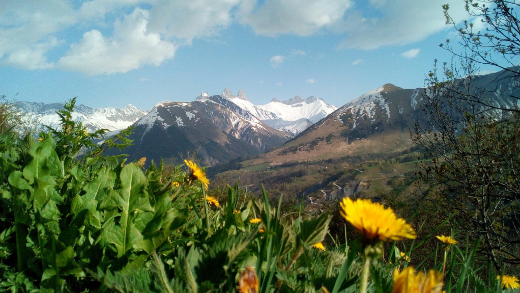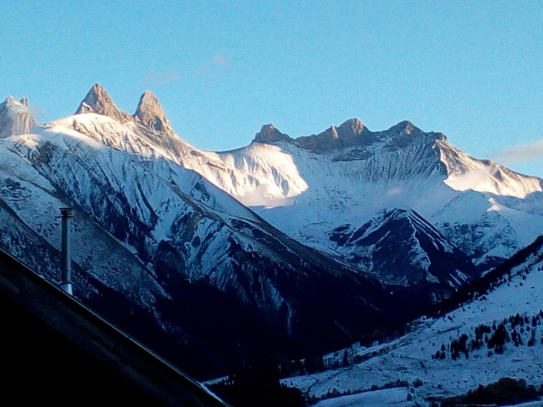 Terrasse plein sud privée et fermée, son casier à skis, son salon de jardin avec vue superbe sur les aiguilles d'Arves.