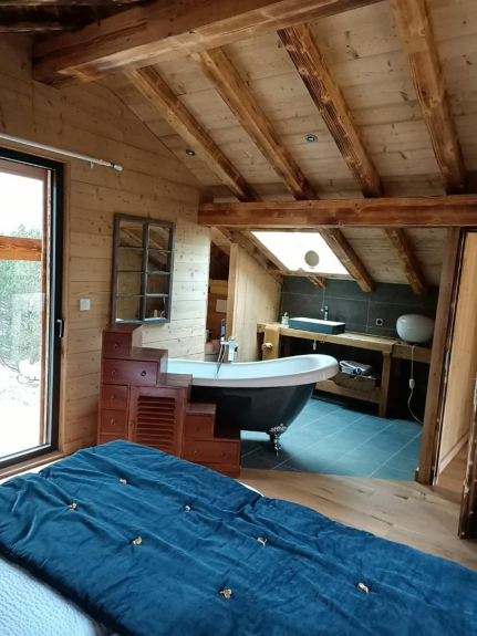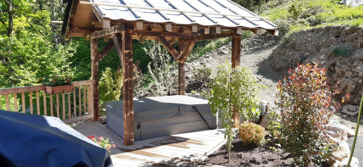 Sur la terrasse très ensoleillée, orientée à l’est et au sud, vous profiterez du jacuzzi, que nous avons voulu végétalisé, ou d’un déjeuner autour du barbecue. De plus, celle-ci, par son espace, vous proposera son coin salon en surplomb du village.