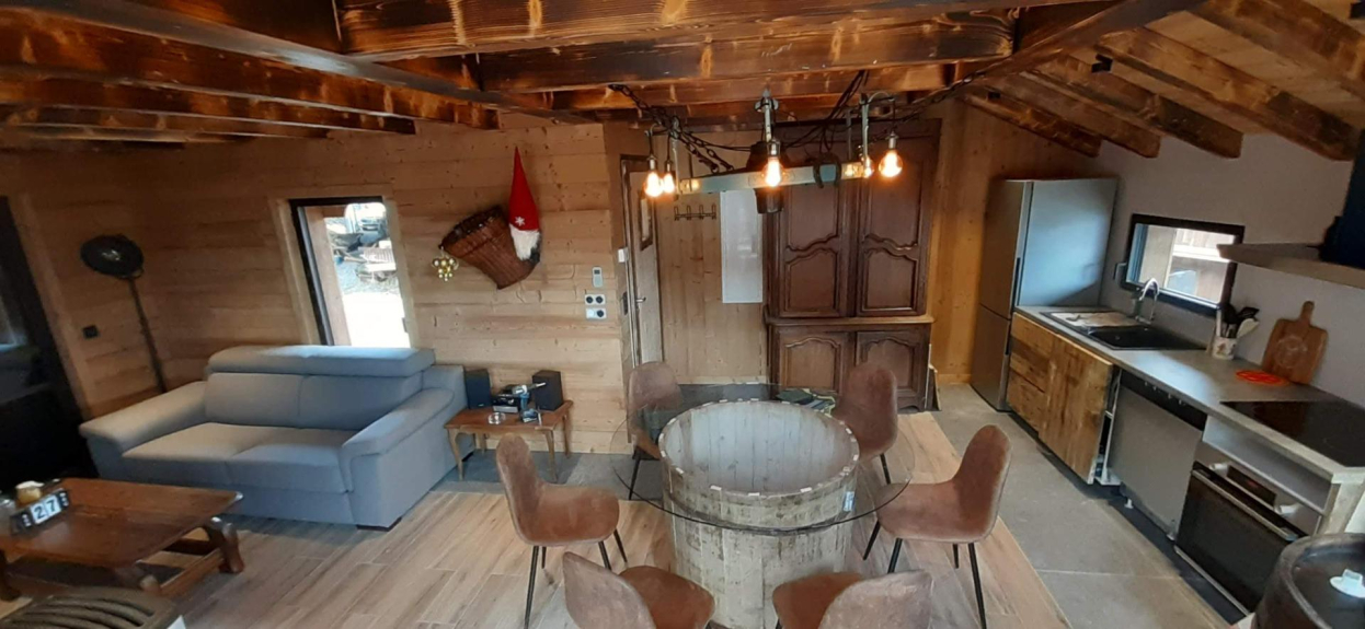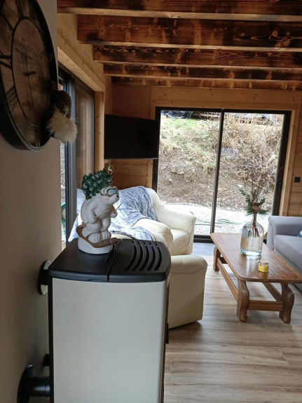 Dès votre entrée, vous serez plongés dans la vallée du Giffre grâce aux larges baies vitrées, qui vous donneront accès à la terrasse. L’espace cuisine ouvert sur la pièce de vie, vous permettra de rester au contact de vos convives tout en ayant un équipement approprié pour exprimer votre art. La large table de ferme sera en prise directe avec le panorama extérieur, comme le salon douillet où vous profiterez de la flamme du poêle, de la vue sur le Criou ou de l’équipement vidéo.
