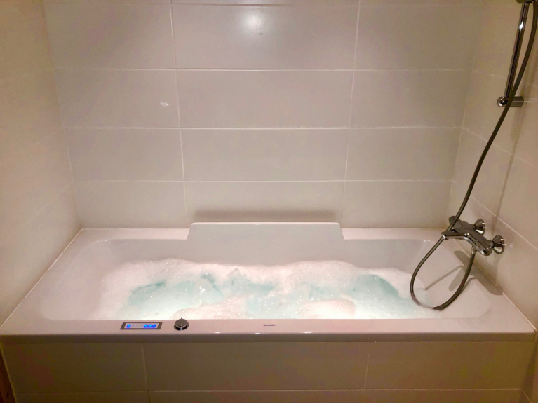 Salle de bain séparée avec baignoire à remous, douche et toilettes.