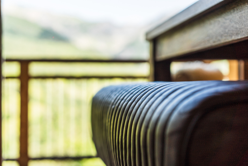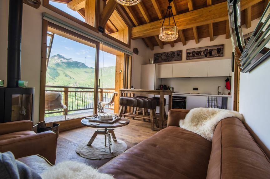 Salon autour du poële à bois, donnant sur un balcon orienté à l'ouest, avec vue dégagée sur les montagnes environnantes. Connexion WIFI pour vos appareils, mais pas de TV.