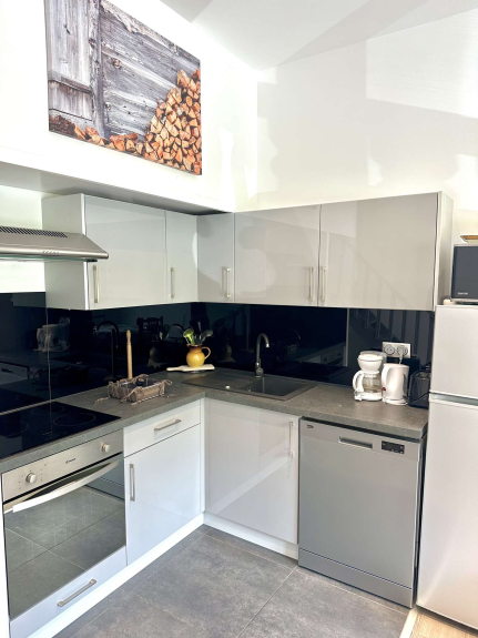 Coin cuisine : four, micro-ondes, lave-vaisselle, réfrigérateur/congélateur, 3 plaques vitrocéramiques, 1 cafetière filtre, 1 bouilloire, 1 grille pain.
