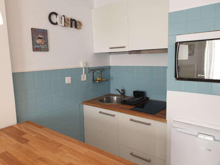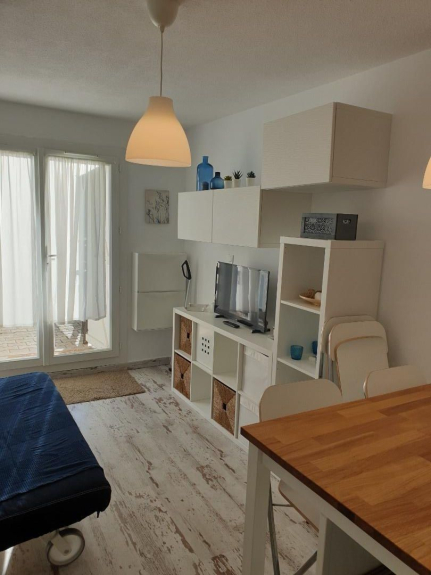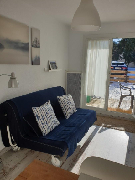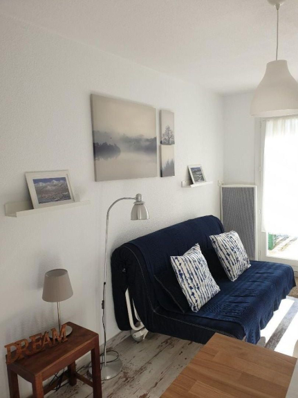 une entrée donnant sur le coin cabine avec lits superposé en 90cm et armoire, suivant une salle de bains avec WC et lave linge; et finalement séjour/cuisine totalement équipée, coin TV avec lecteur DVD et canapé BZ. Grande terrasse avec table, parking gratuit devant la résidence.