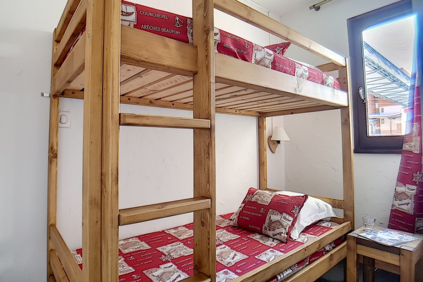 Cabine (séparée du séjour par une porte, avec fenêtre) : 2 lits 1 personne superposés.