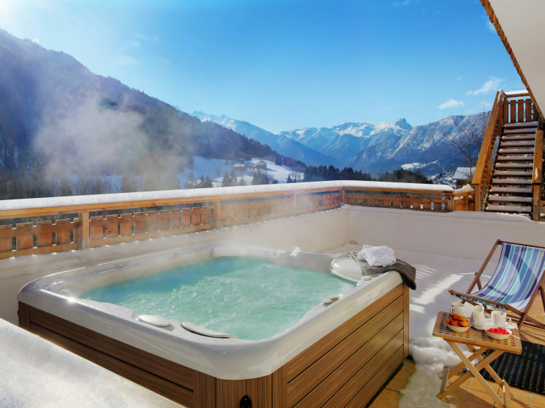 À l'extérieur, les vues panoramiques depuis le jacuzzi, sur la terrasse plein sud à l'avant du chalet, sont calmes et paisibles.