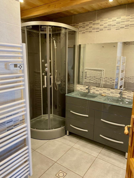Salle de bain avec douche, lavabo double vasque, sèche-cheveux, sèche-serviettes,