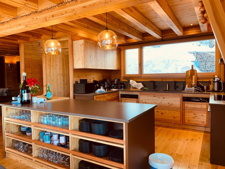* Espace cuisine : plaques induction, grand four, 2 lave-vaisselle, 2 réfrigérateurs, cafetières (senseo, nespresso, flitre), machine à glaçons, appareils à raclette, fondue, rangements ;